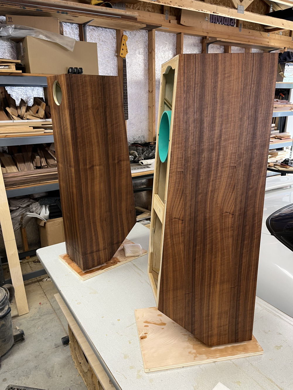 Time for the finish. This time around I tried Osmo. This happened because I wanted a base that I could clear over. I wanted the cabs to be satin and the baffles to be gloss. I originally wanted to try the Rubio stuff because of the way Javads speakers looked, it really brings out the natural look and tone of the wood. After contacting Rubio, they didn't recommend being able to lacquer or 2K poly over their finishes.
