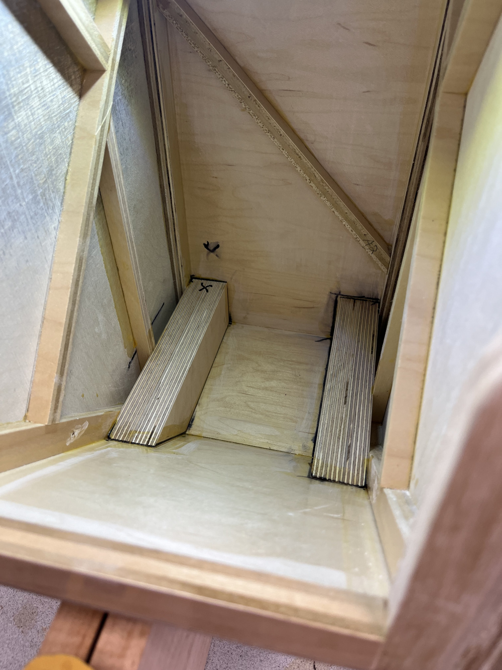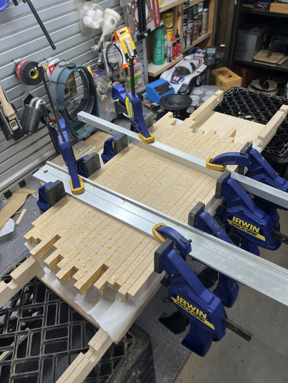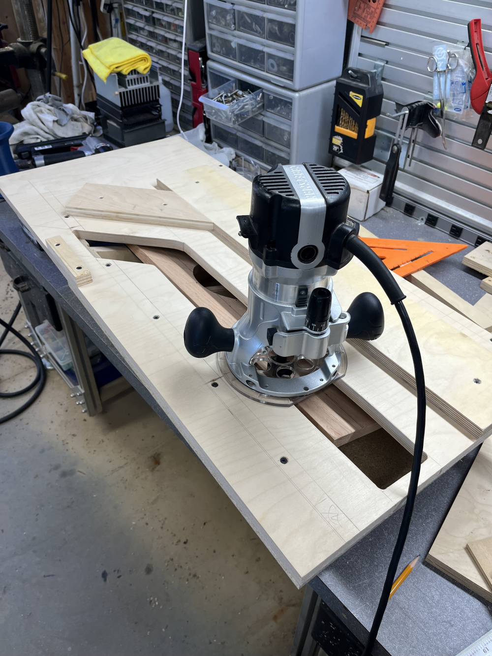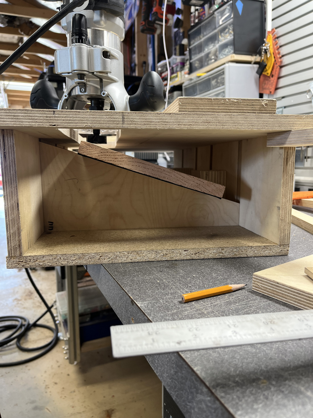 Today was a day I've been thinking about for awhile now. I've been thinking of how to cut the bevels on either side of the baffles..... without screwing something up. I came up with a plan for a jig and as I was building it, I really tried to make it work for cutting both sides. Here's what transpired: