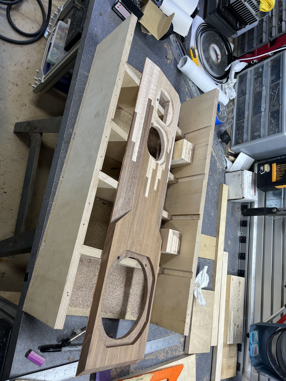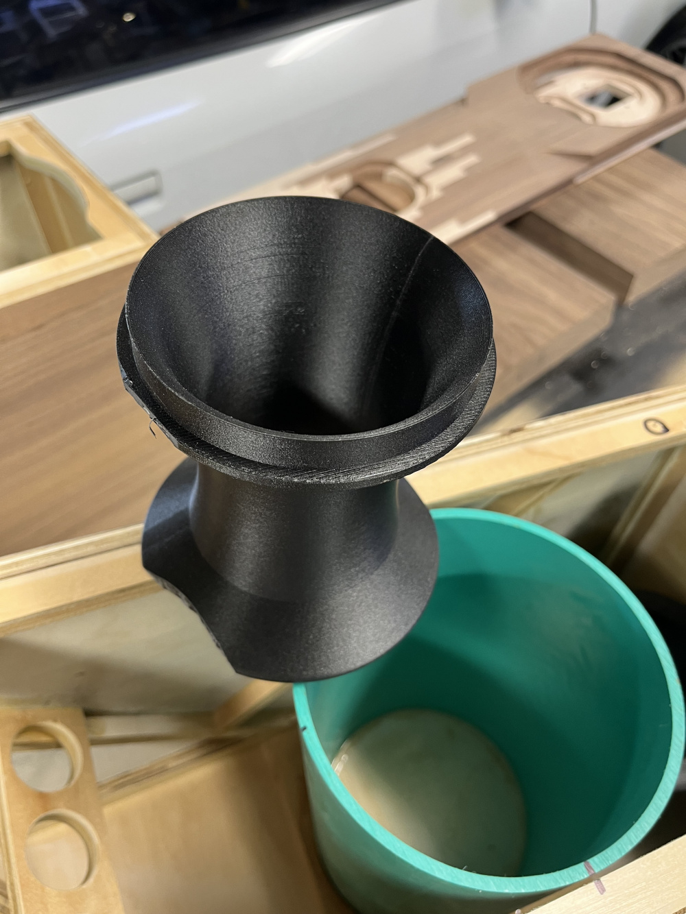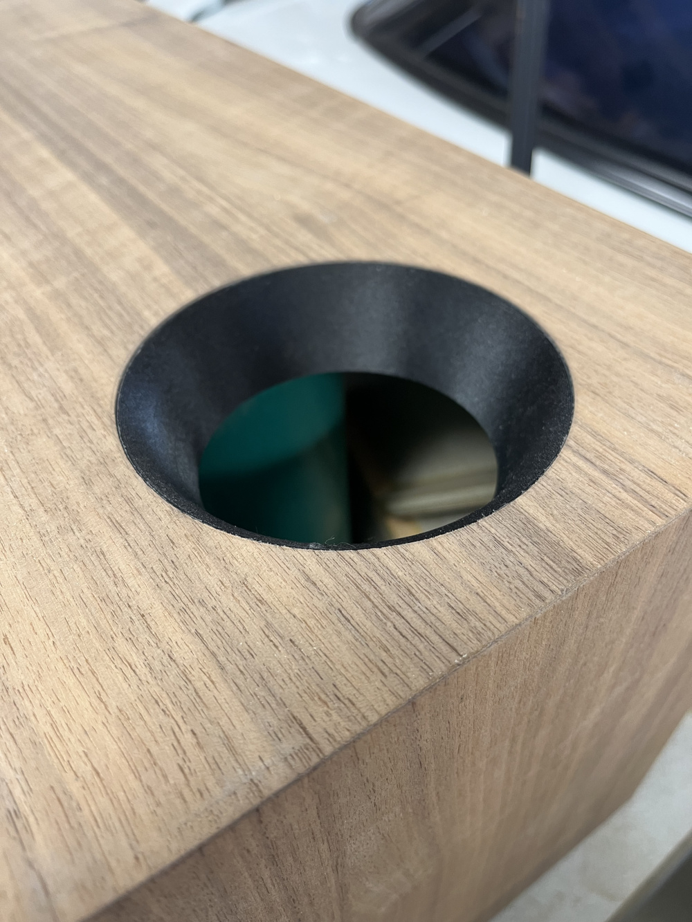 Also got the holes done to mount the ports though. I'm going with a rear mounted port because of the tight space I have to work with to get it up above the mid pipe, behind the tweeter. Adam is printing them up in PETG CF. This was a trial piece to get the depth stop dialed in so it'll be flush to the outside of the enclosure.