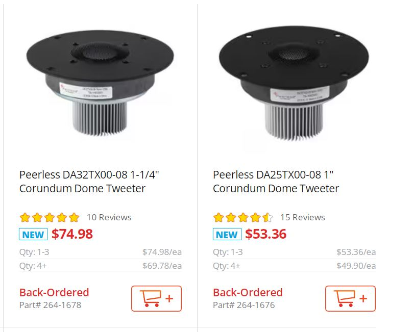• I got the email from Parts Express. It said "Now in Stock and Ready to Ship". I checked out the 3 pages of Peerless drivers. Out of 3 pages only one driver was actually in stock and ready to ship. The rest were all on back order. LOL at PE!