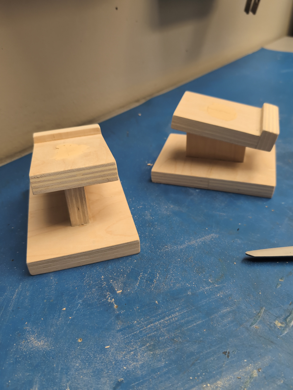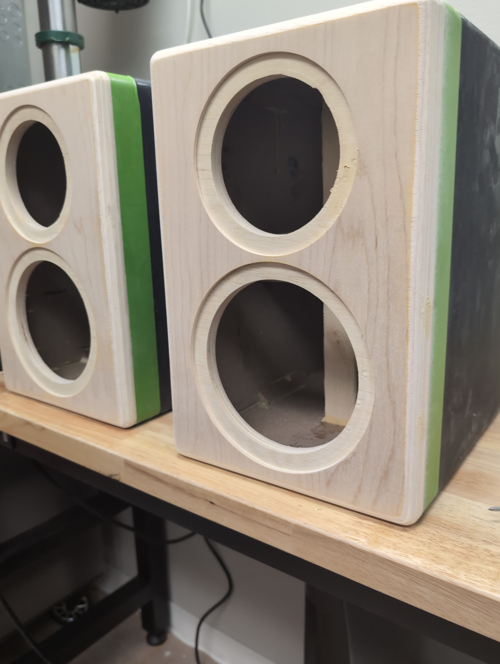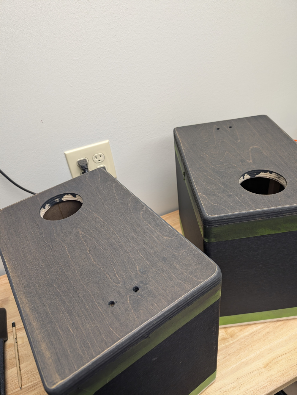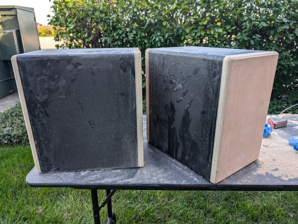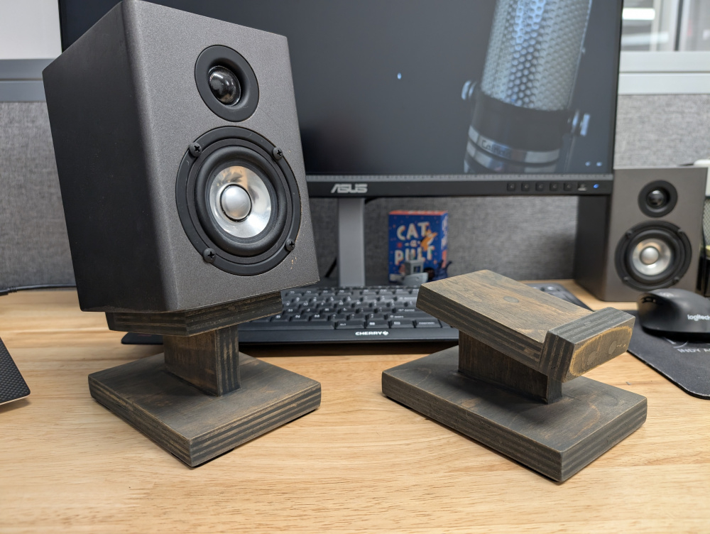 • And some bonus content! Used some scrap wood from the front baffle to make lil speaker stands for the JB Quarks; they will now become my work desktop speakers. Finished with Watco Grey Carbon Danish OIl.
