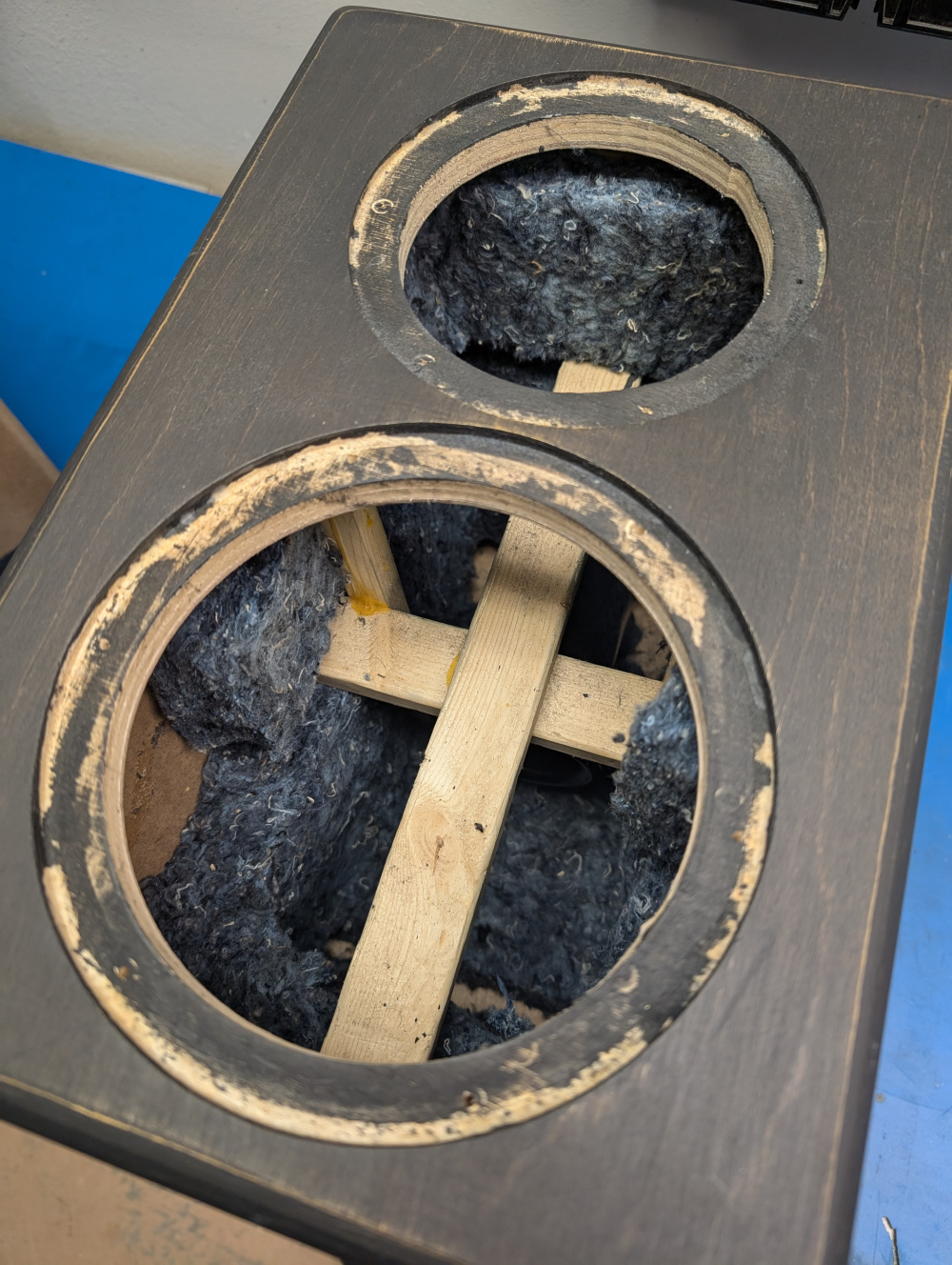 The original enclosures are made of 1/2in MDF, and had no internal bracing. Some light polyfill stuffing was in there, but probably not enough. I added bracing before attaching the front baffle. A cross brace horizontal and vertical, and some smaller braces from the front to the back.Some denim acoustic lined the enclosure.