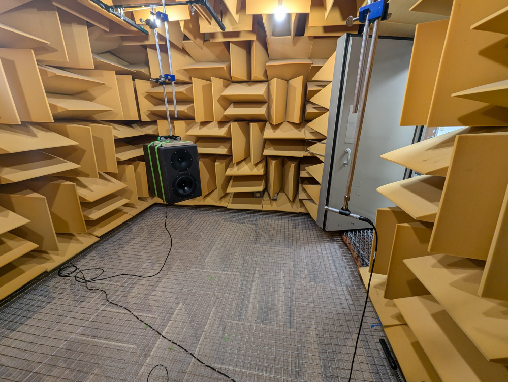 A full anechoic chamber, I’m jealous! The one I have easy access to doesn’t have a suspended mesh floor. Instead you have to play a game like those sliding tile puzzles to move the absorption foam on the floor and it’s only good to a theoretical 200 Hz.