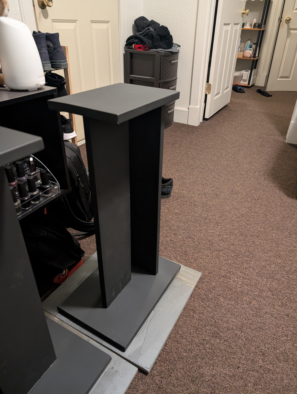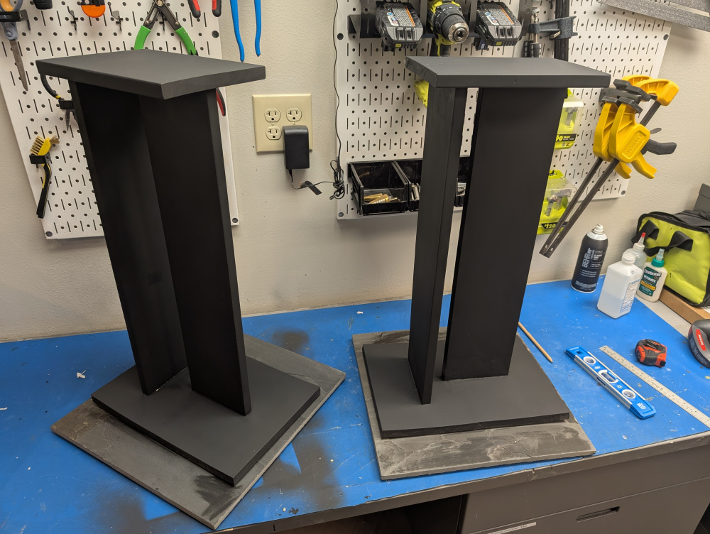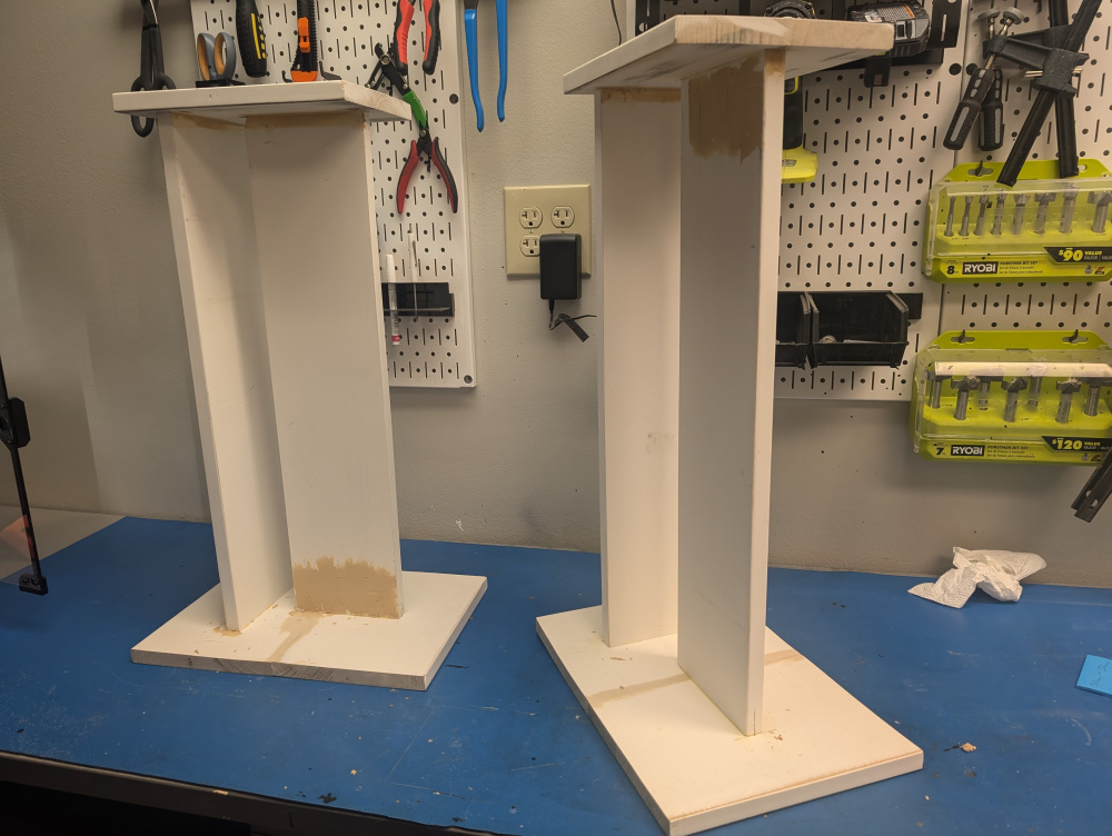 The speaker stands I also made. Bought some preprimed pine panels from Menards. Ended up being more of a paint than just plain wood; the primer coating kind of "gripped" the shoe of the circular saw when cutting, making it hard to smoothly move and cut. The panels also ended up quite warped.