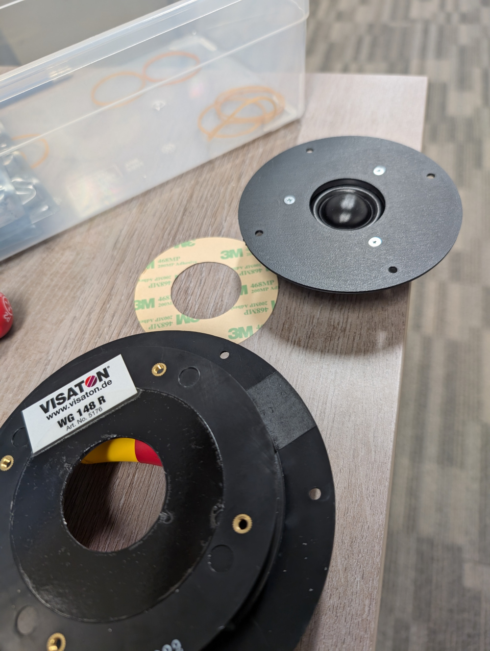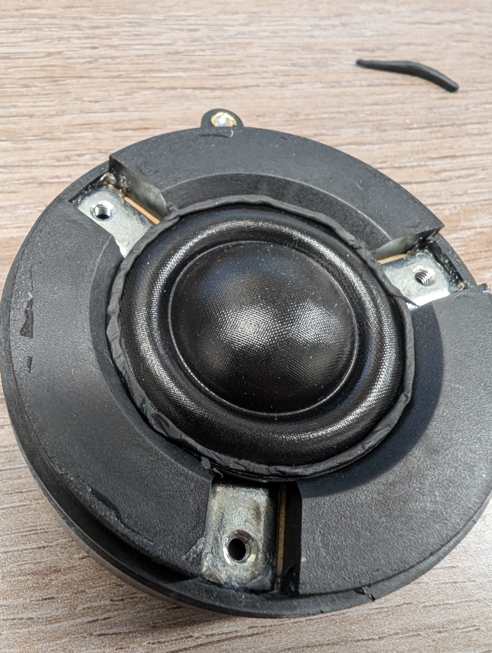 • Attaching the tweeter to the waveguide was next. Removed the front plate of the tweeter was quite easy, 3 screws, and some careful prying. I designed and 3D printed a mating plate to the tweeter to the waveguide out of ASA. Was attatched together with some 3M double coated adhesive tape; cut to size on a Cricut. A bit of speaker caulk around the tweeter dome ensured everything was sealed properly. I can post the STL file of the adapter bracket if anyone would like.