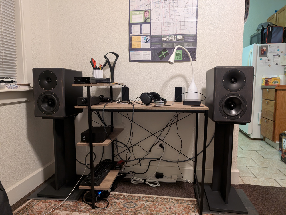 Final (current) place. Will be buying a house and moving in a few weeks; and they'll have some more room soon! Powered by an ICEpower amp in a ghent audio case; from a raspberry pi music server running moode audio out to a Khadas Toneboard DAC.