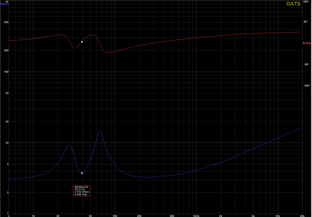 So the 300hz dip is "real", in an in-room setting. The raw frequency response of the woofer (below) from the chamber shows no dip, and the modeled room response I used in VituixCAD does.
