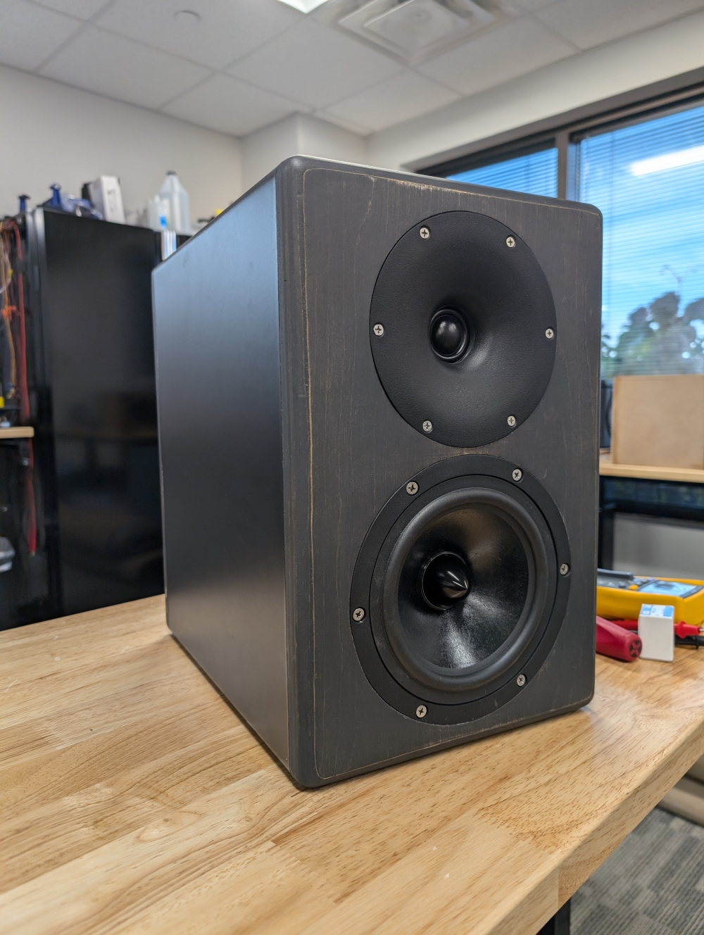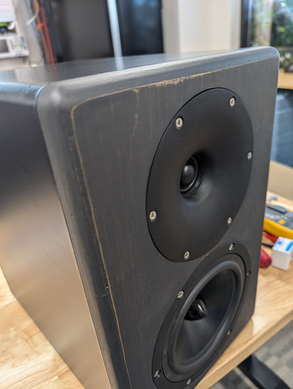 For the finish, I wanted a black color; that allowed some grain to show through. Originally I used a carbon grey danish oil by Watco, but didn't find it dark enough. Ended up changing to General Finishes Graphite water based stain, with their flat out flat topcoat. Quite liked how it turned out! I originally intended to keep the original black vinyl wrap on the speaker, but didn't protect it well enough during all the work. It got quite dinged up and scratched. Simply removed it and replaced it with another vinyl in matte black. I slightly sanded through the oak veneer as it goes; but wasn't too upset with the overall look and aesthetic. Adds some contrast. Finished with stainless steel screws. Up next is measurements and crossover design.