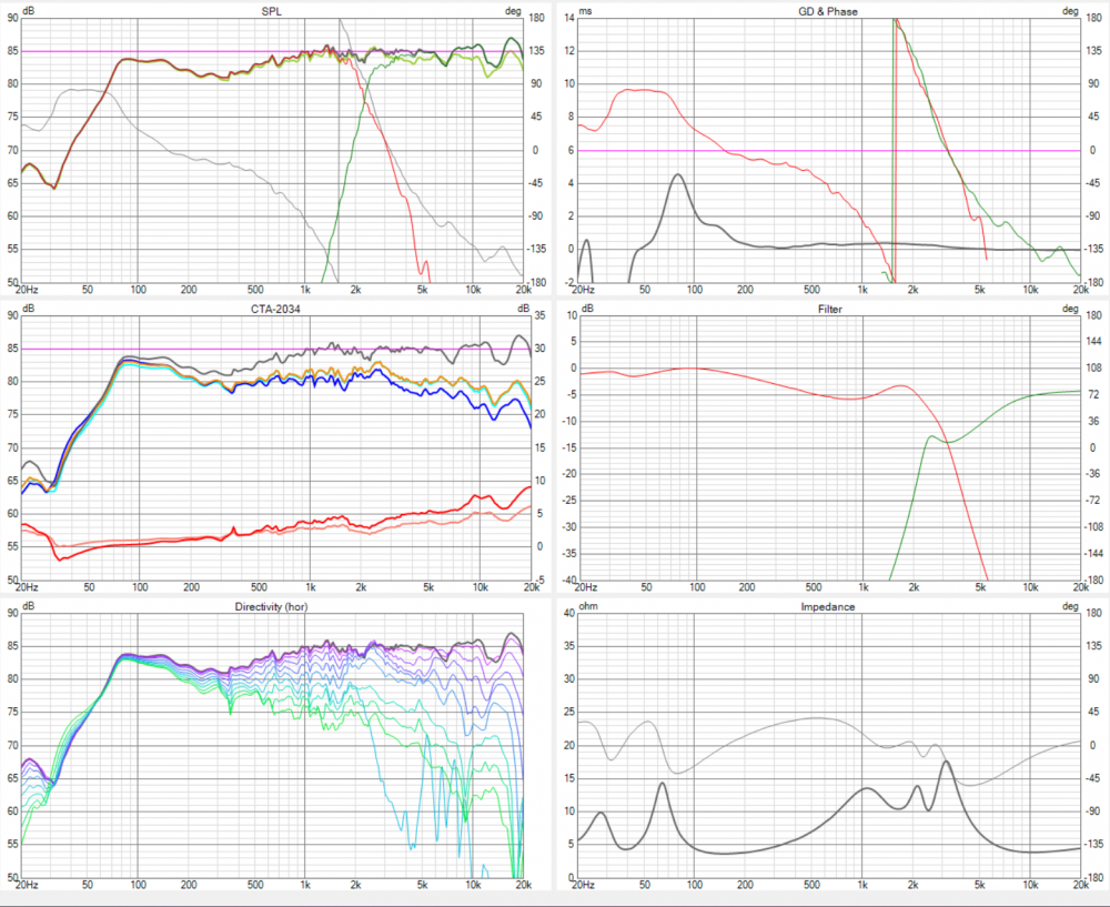 Crossover took a bit of time to sort out. Tried quite a few iterations, but settled on a fourth order; with some padding on the tweeter. A few wiggles up high in the frequency range from the waveguide. I concentrated more so on the sound power DI and listening window; tried to not overthink the on axis linearity as much. Crossover point as 2,200hz, higher than I planned, but everything looked fairly nice. Pushing it lower seemed to cause more issues around 2-3k. Only a mild directivty dip at 2k.The 300hz dip is a measurement artifact; as our chamber is accurate down to around 80hz. Note tweeter is inverted.