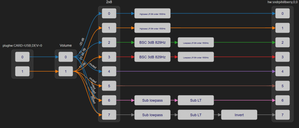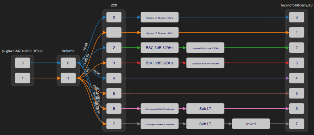 I was using a Hifime S2 Digi to capture optical, but switched to a Scarlett 6i6 which has coax in as I was getting noise on one channel and swapping cables and settings didn't seem to help. If I didn't need more than 4 channels, I could use the Scarlett outputs. I have a hifiberry Dac8x hat on the pi. I will backup my configurations for CamillaDSP in the event of a corrupt SD card. That way I just have to rebuild the pi and put my configurations back on. I could also make a copy of the SD card if I settle on a configuration.