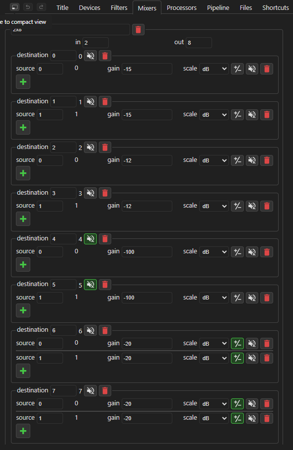 Channel 7 is inverted from 6 as they make up the balanced input for the sub amp. What you don't see is that both channel 6 and 7 are a sum of the L (channel 0) and R (channel 1). You can also see the level matching between the tweeter and woofer on the mixer tab.