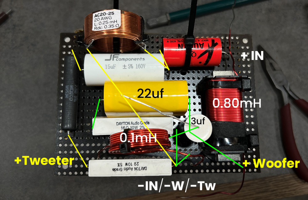 Working slowly, but getting close to having these finished up. I was a little worried about the number and sizes of the parts needed for this parallel network. The perf boards are fairly small so they fit through the woofer holes. This isn't ideal when it comes to inductor spacing, but I think I have the puzzle solved. I'll squeeze the 0.22uf caps in there - maybe on top of L2.