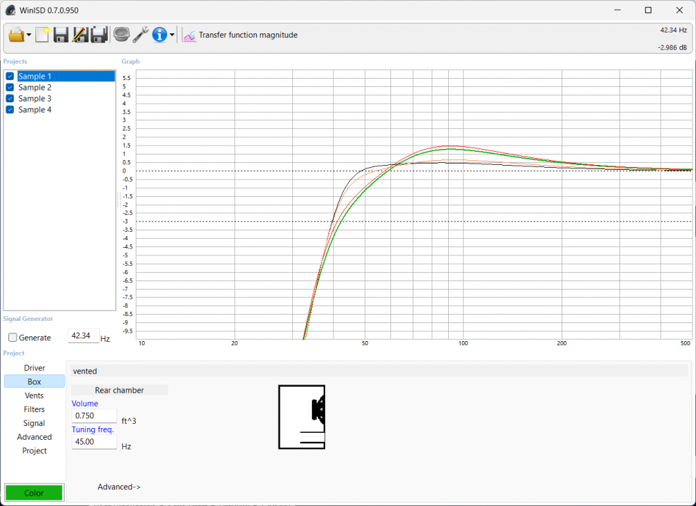 Anyways, cast basket and a poly coated paper cone. Two are a decent match to each other, and the other two are a decent match to each other, but the two pair are a bit different. Sensitivity is high for such a small driver with such high impedance, around 87db, but the Hoffman law holds true and they require a large enclosure. In the modeled 0.75 cubic foot they extend low 40s upper 30s - not bad for a 6" driver.